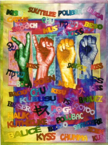 IN ANY LANGUAGE, thus the title, there is at least one word for the word 'kiss'. This includes 'sign language' where the four hands spell the four letters of the word. KISS conjures cheerful times, no matter what the language, so bright colors are arranged to highlight the feeling.