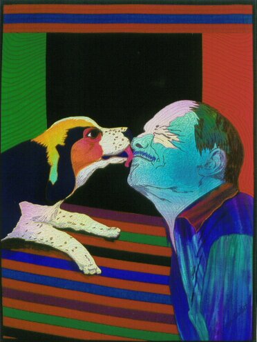 Freckles, our six month old beagle, loves to kiss on the mouth, although we prefer to get her kisses only on the ear. I took many photos of her kissing my husband Bob to get just the right pose, I think Bob was a good sport to tolerate so many puppy smooches. The fabrics used in the faces were hand dyed and painted, then appliqued and embroidered by machine.