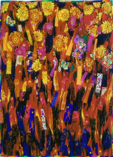 Synesthesia occurs when one of the five senses evokes the sensation of another. Hearing a high pitched sound may cause one to visualize a bright color and jagged shapes, while a deep sound may evoke a dark color and rounded shapes. While many of us have a vague "crossing of the senses," some people experience strong synesthetic sensations. This quilt is a visual representation of the feeling (the touch sensation) one experiences during a passionate kiss.