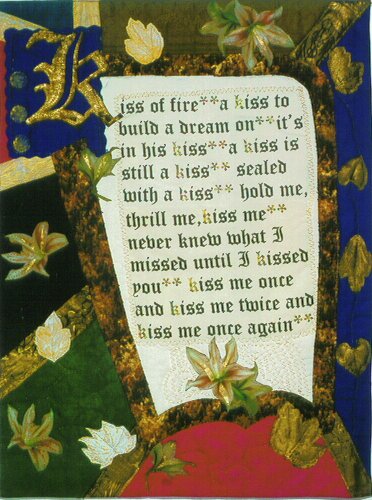 When deciding how to interpret the "kiss" theme, words of songs from the past kept popping into my head. It wasn't until I was looking through art books for inspiration and came across one on illuminated manuscripts that it all came together. The myths about romance expressed in these songs could be presented in the same format as the older stories found in the manuscripts; each told of a cultures beliefs, hopes and dreams.